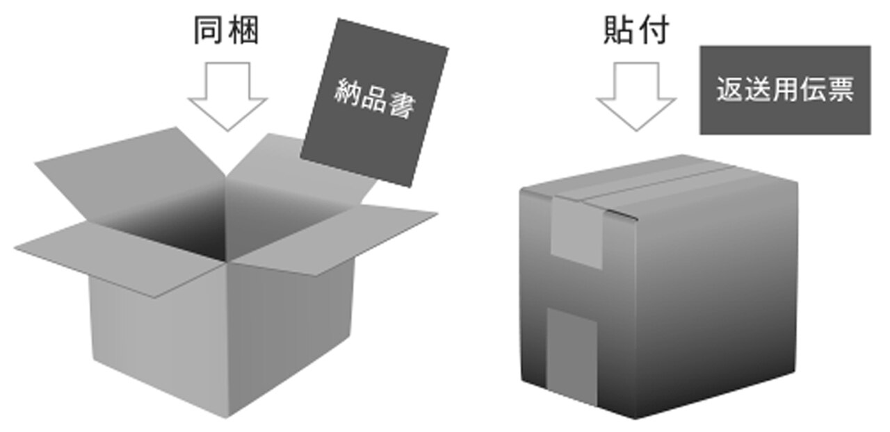 到着時のダンボールに商品(袋、タグ、付属品など送られてきた品物すべて)と「領収書兼納品書」を同梱してください。同梱されている「着払い」の返送用伝票に必要事項を記入し、ダンボールに貼付してください。