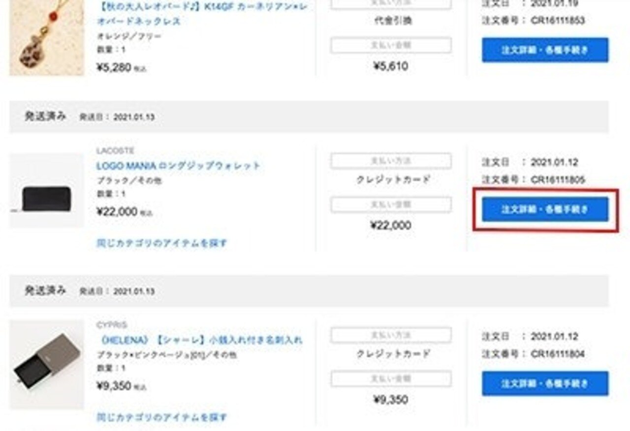 「注文・配送履歴の確認」から『注文詳細・各種手続き』をクリックするとお客様のご注文履歴の詳細が表示されます。