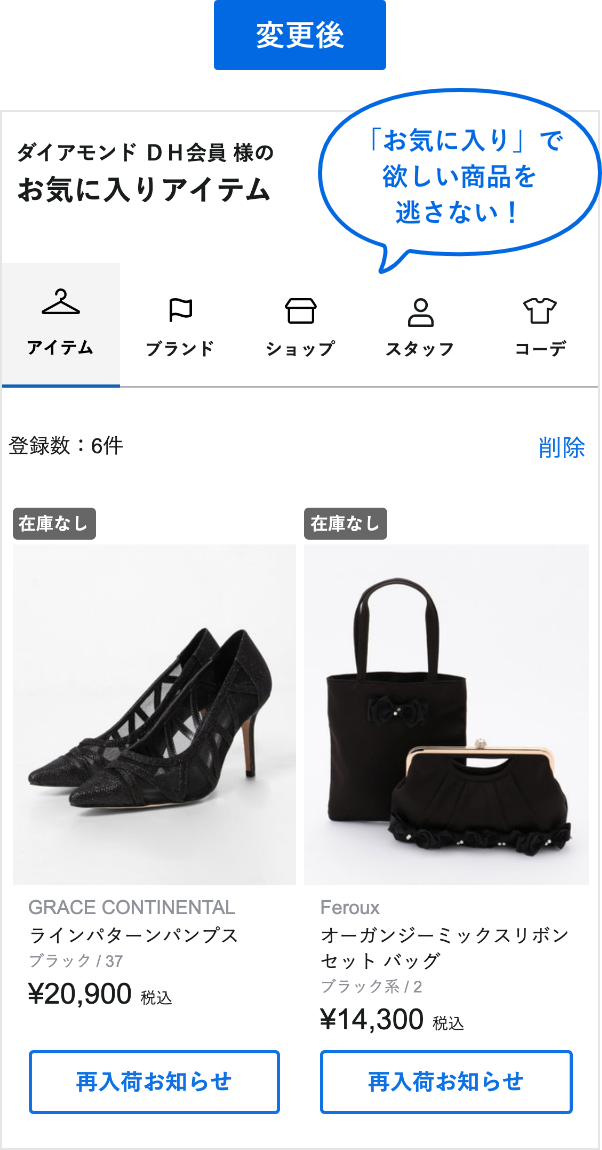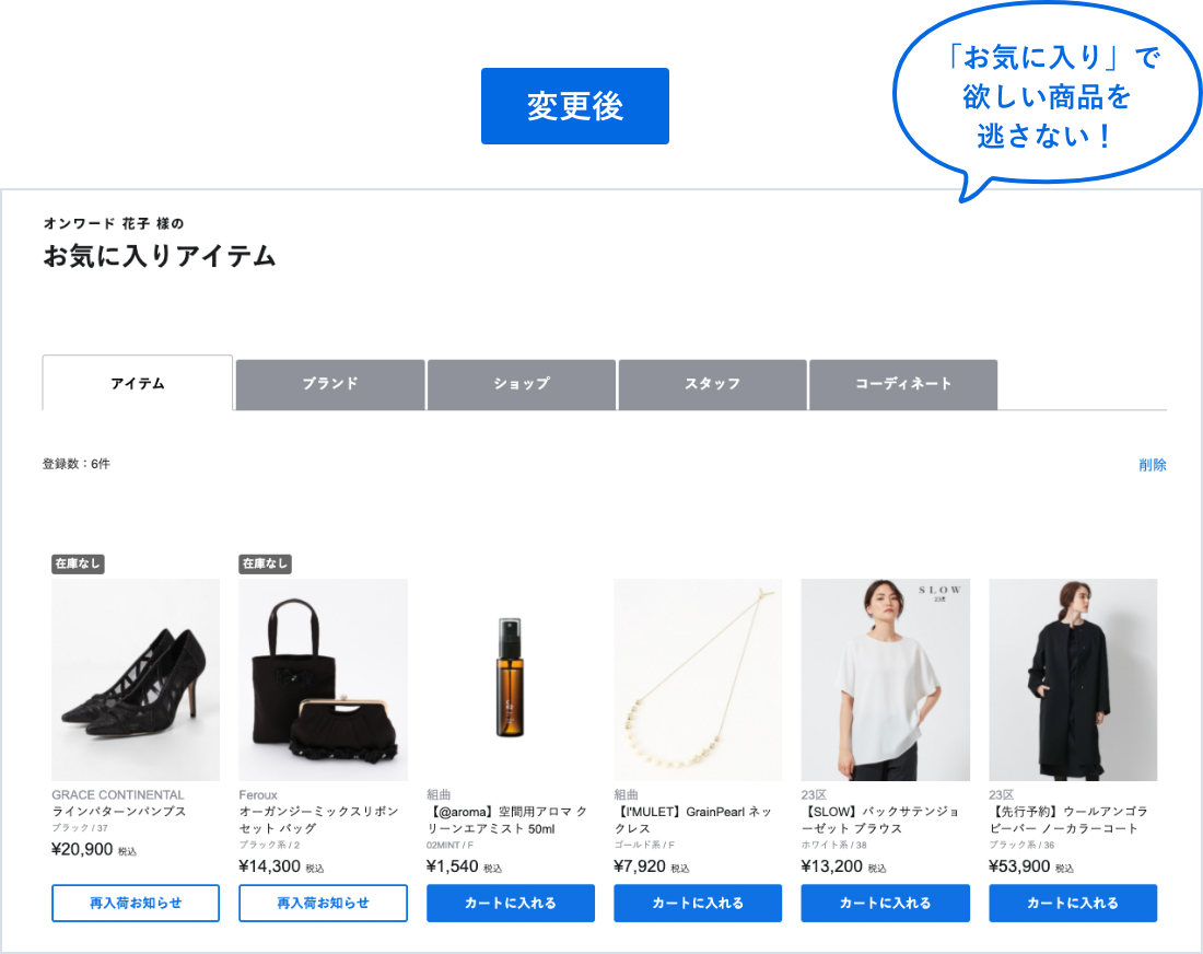 アイテムやブランド、コーディネートまで、登録したすべてのお気に入りをタブ切り替えで確認ができます。
