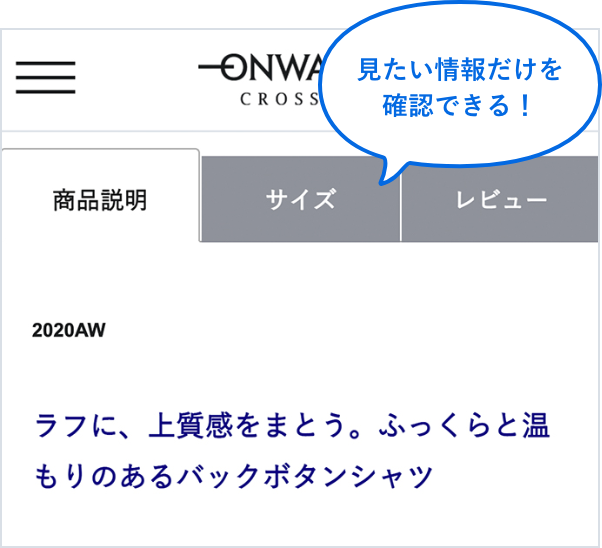 商品の詳細ページはタブ切り替えなどで、以前の縦に長かったページを改善。長くスクロールをせずに、欲しい情報が確認できます。