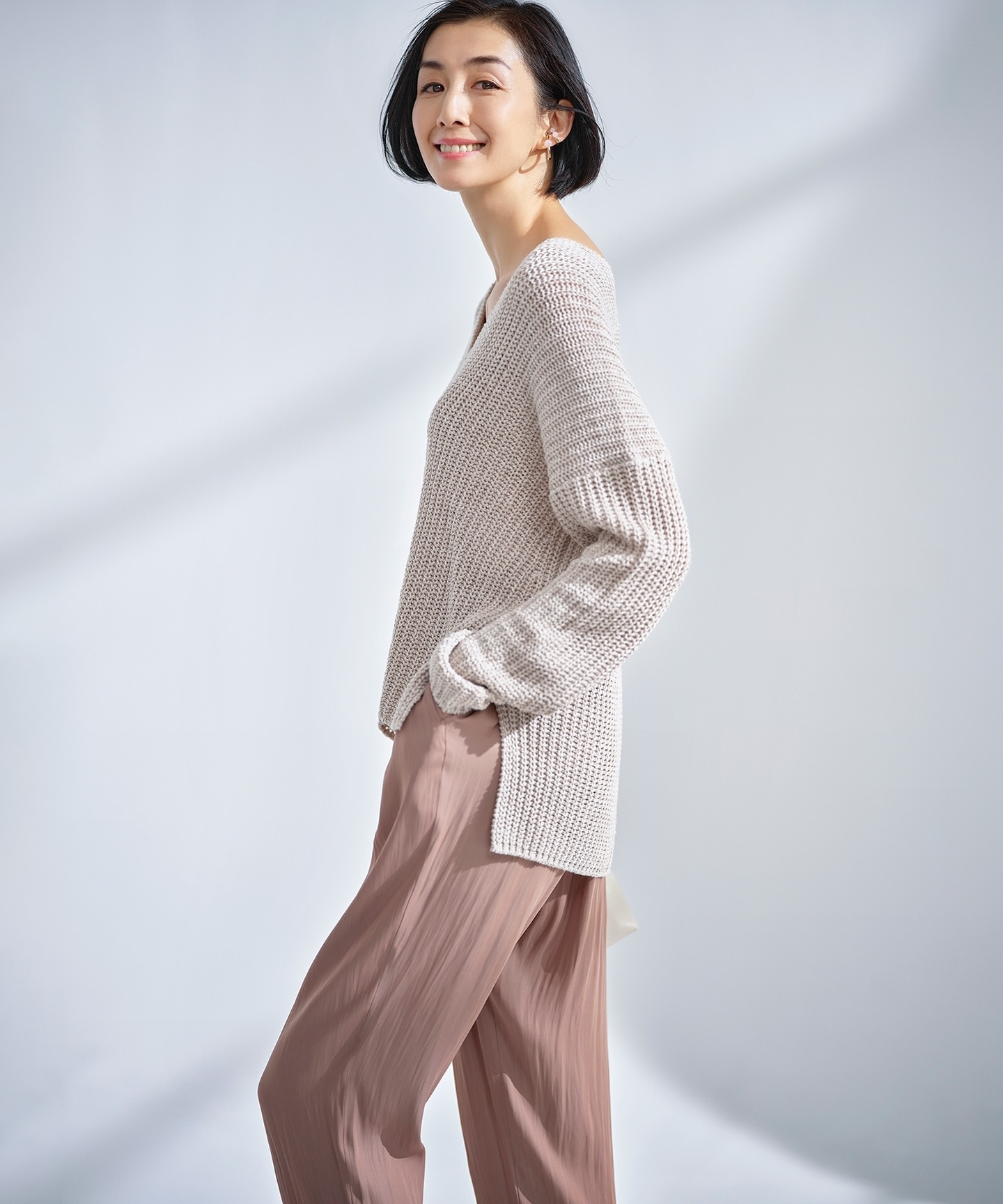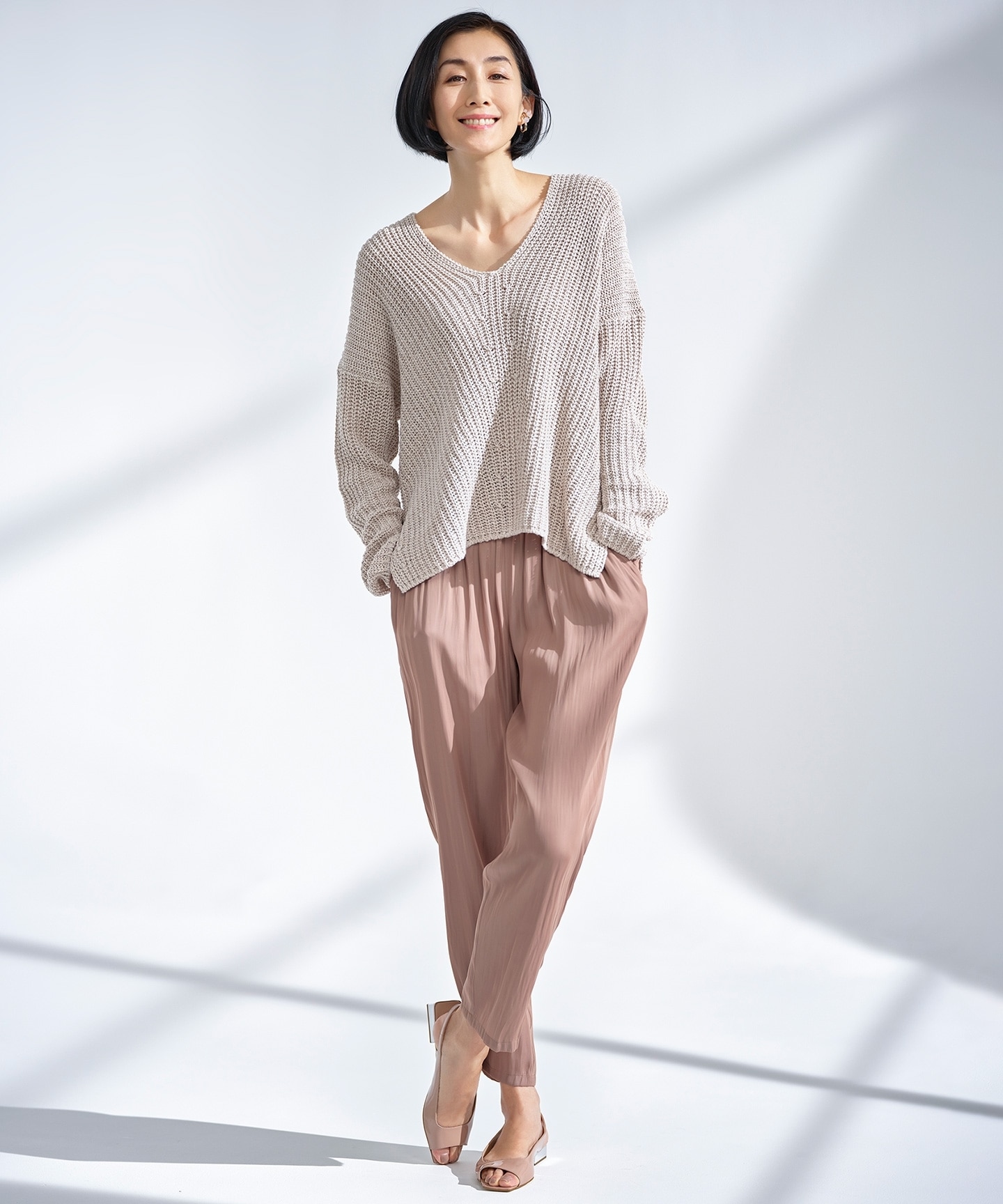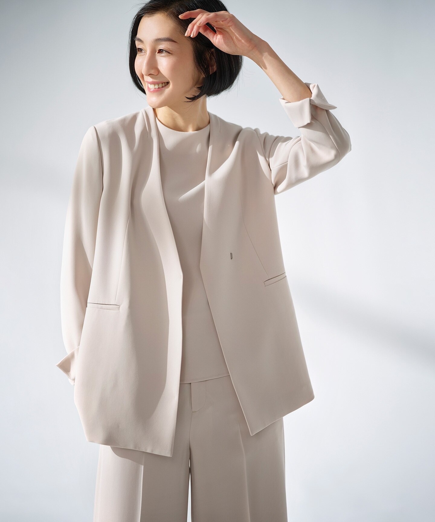 まだ寒さの残る日にさっと羽織れるアウターやニットアップも充実。