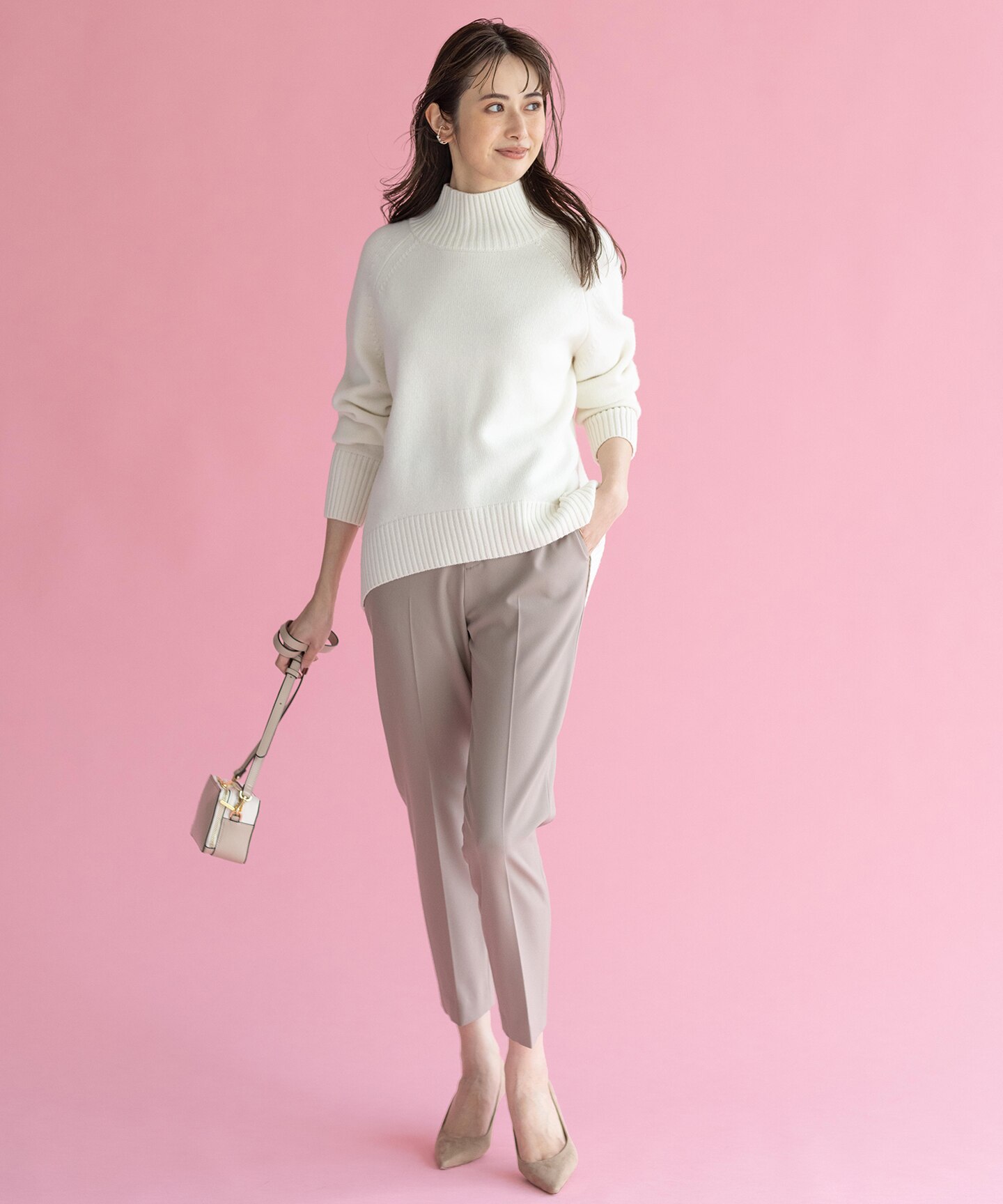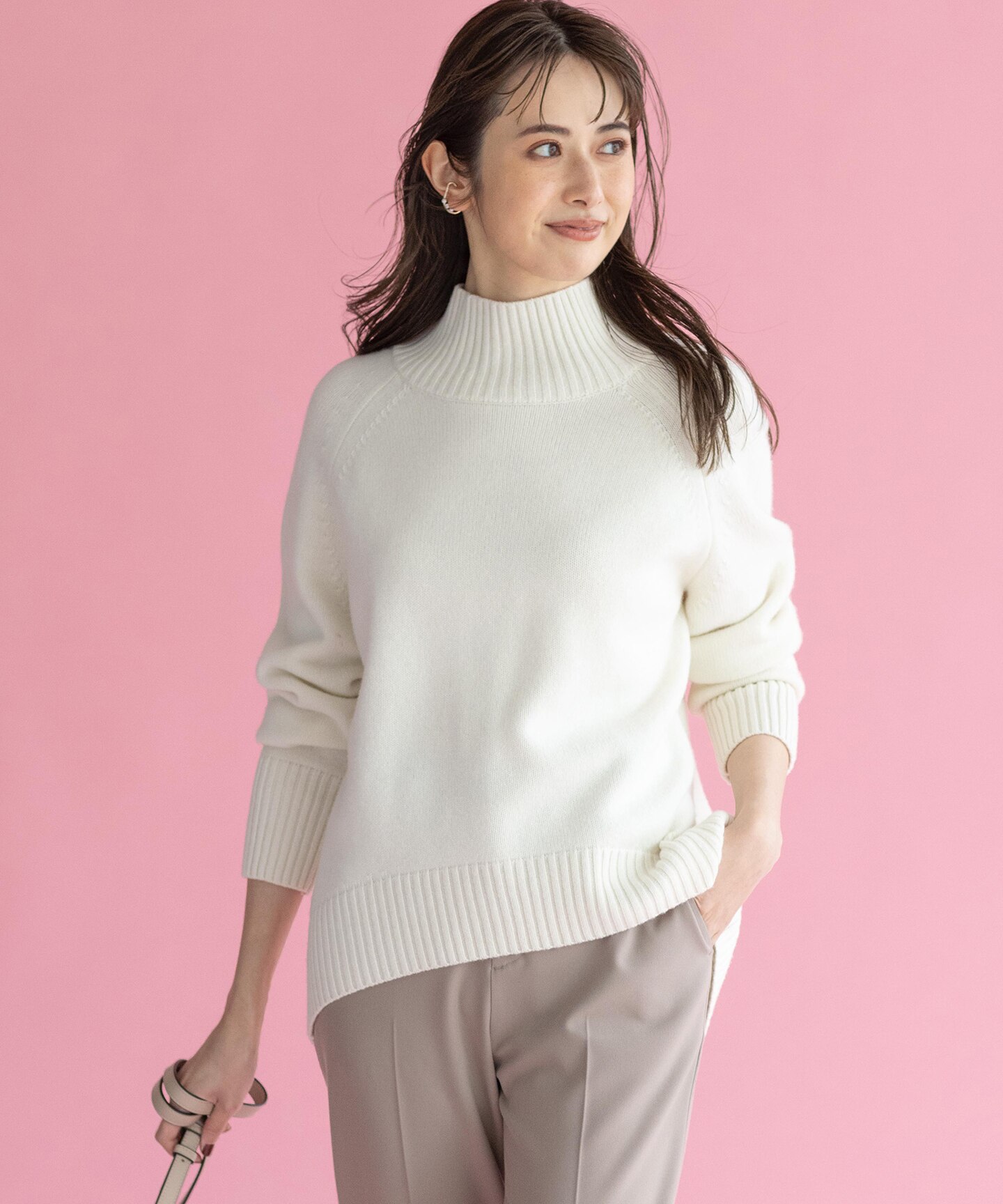 華奢見えするハイネック、カジュアル過ぎないのが魅力のニットフーディーなど。