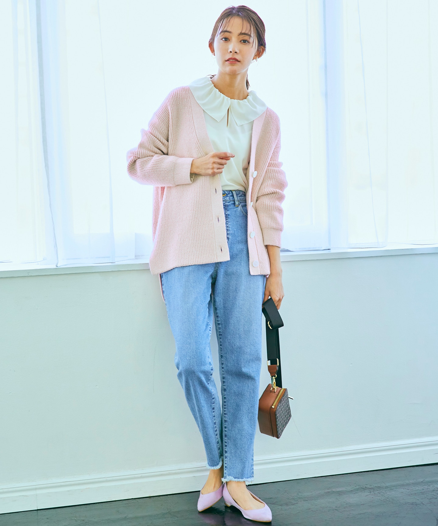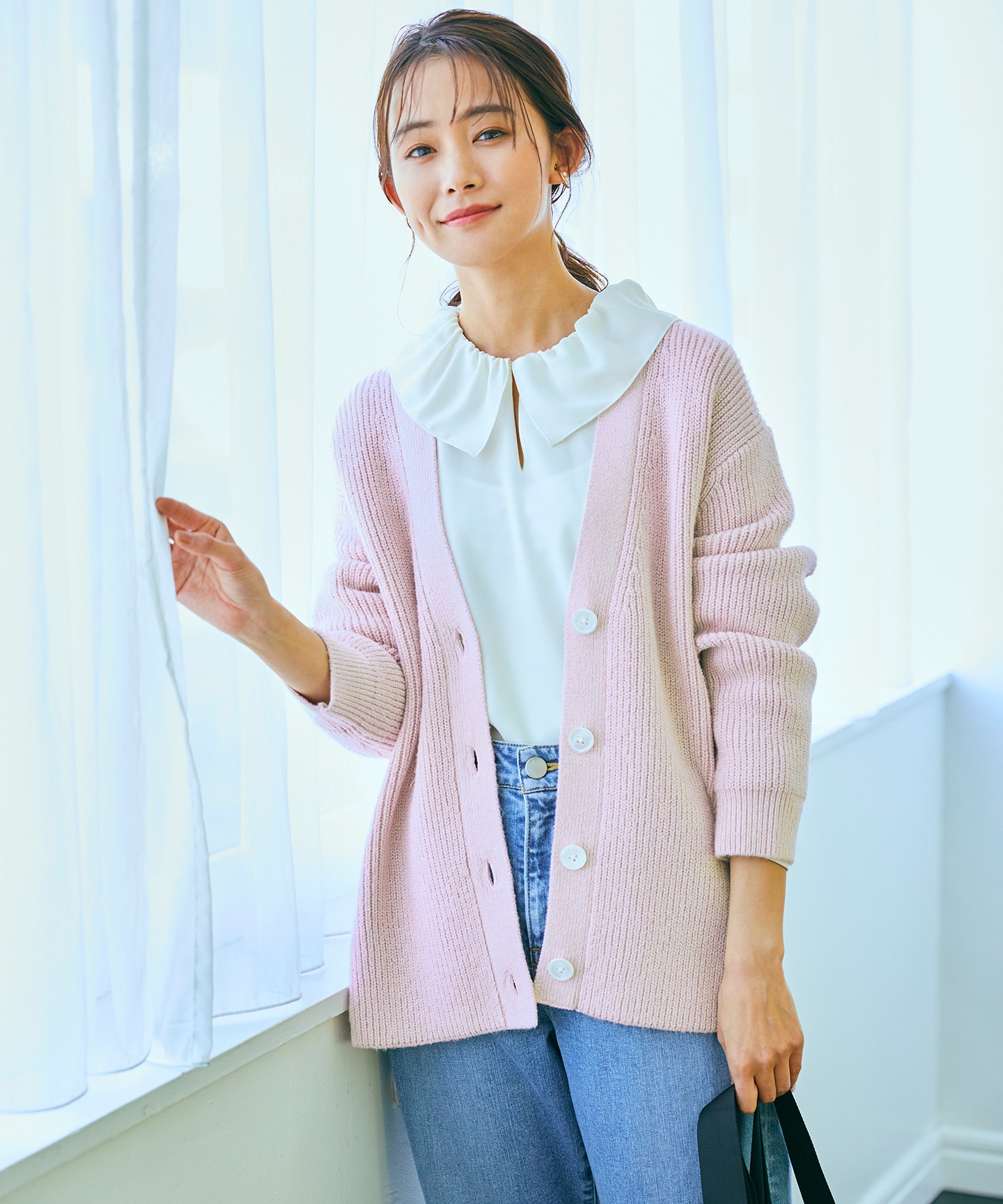 • 前後差とサイドスリットを入れることでスカートにもパンツにもマッチする春カラーのニットカーディガン。パッと目を引くピンクの女性らしいカーディガンは今から春にかけて着たい。冬のコーディネートのマンネリ化におすすめのアイテムです。