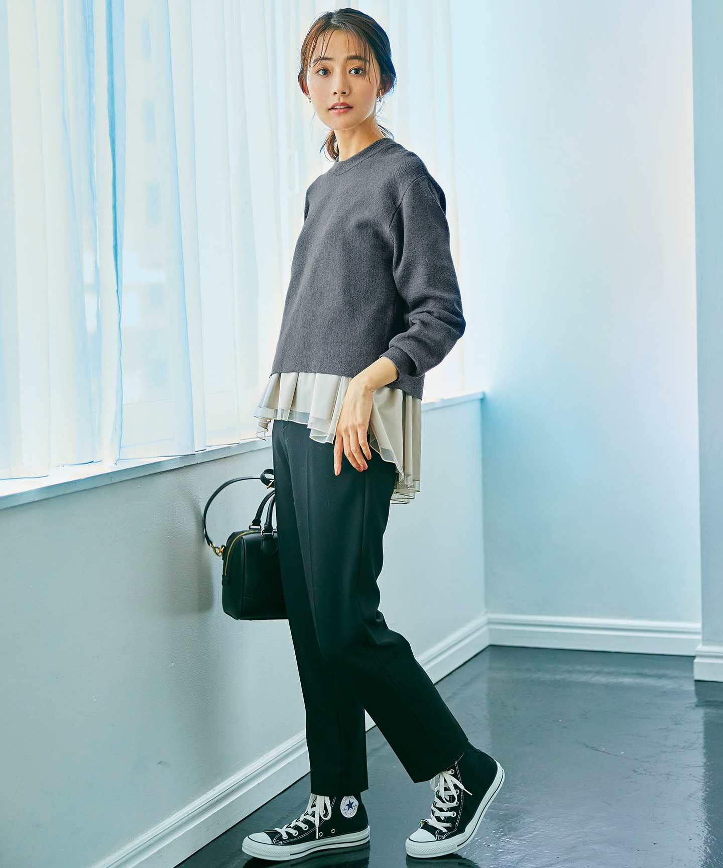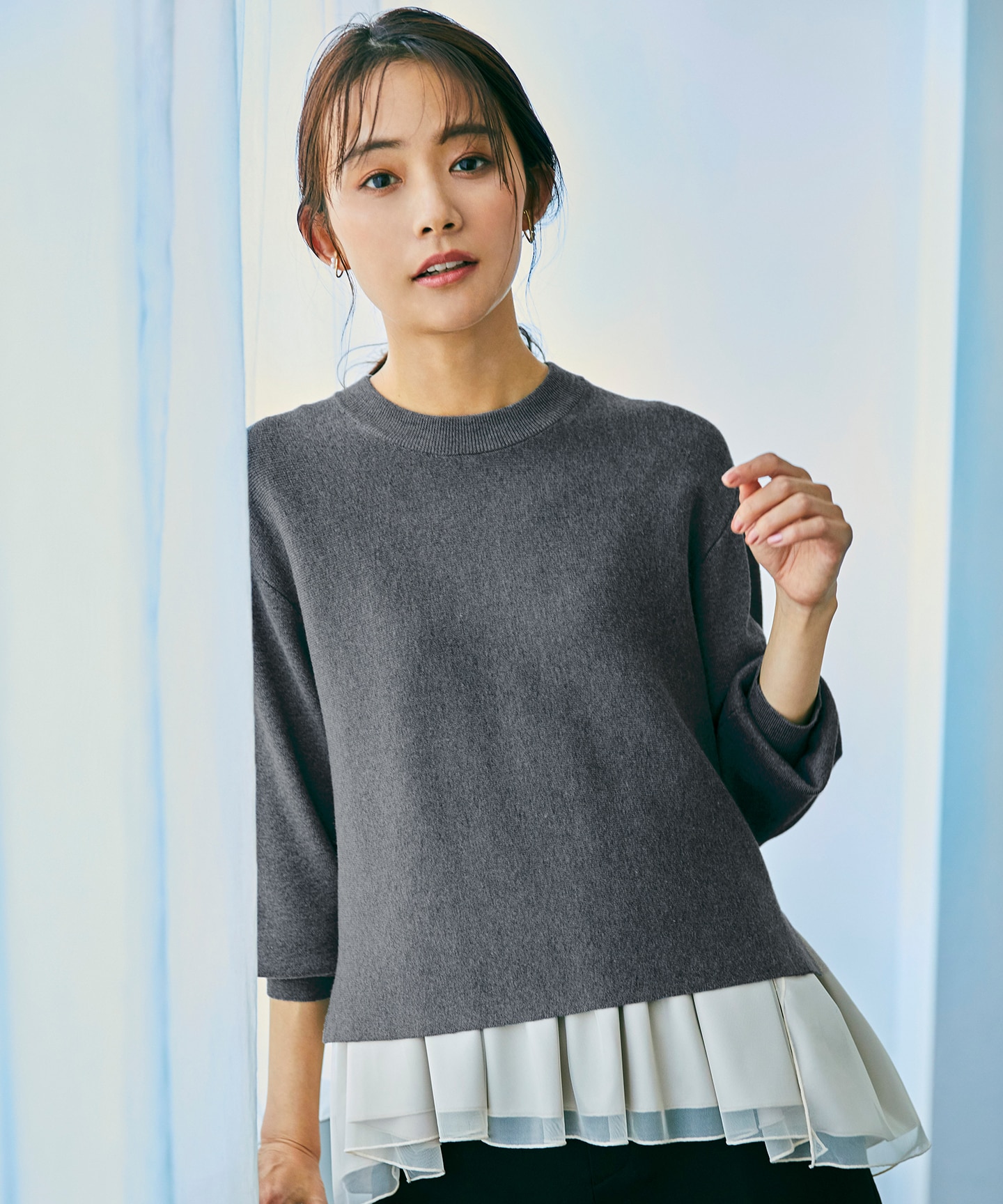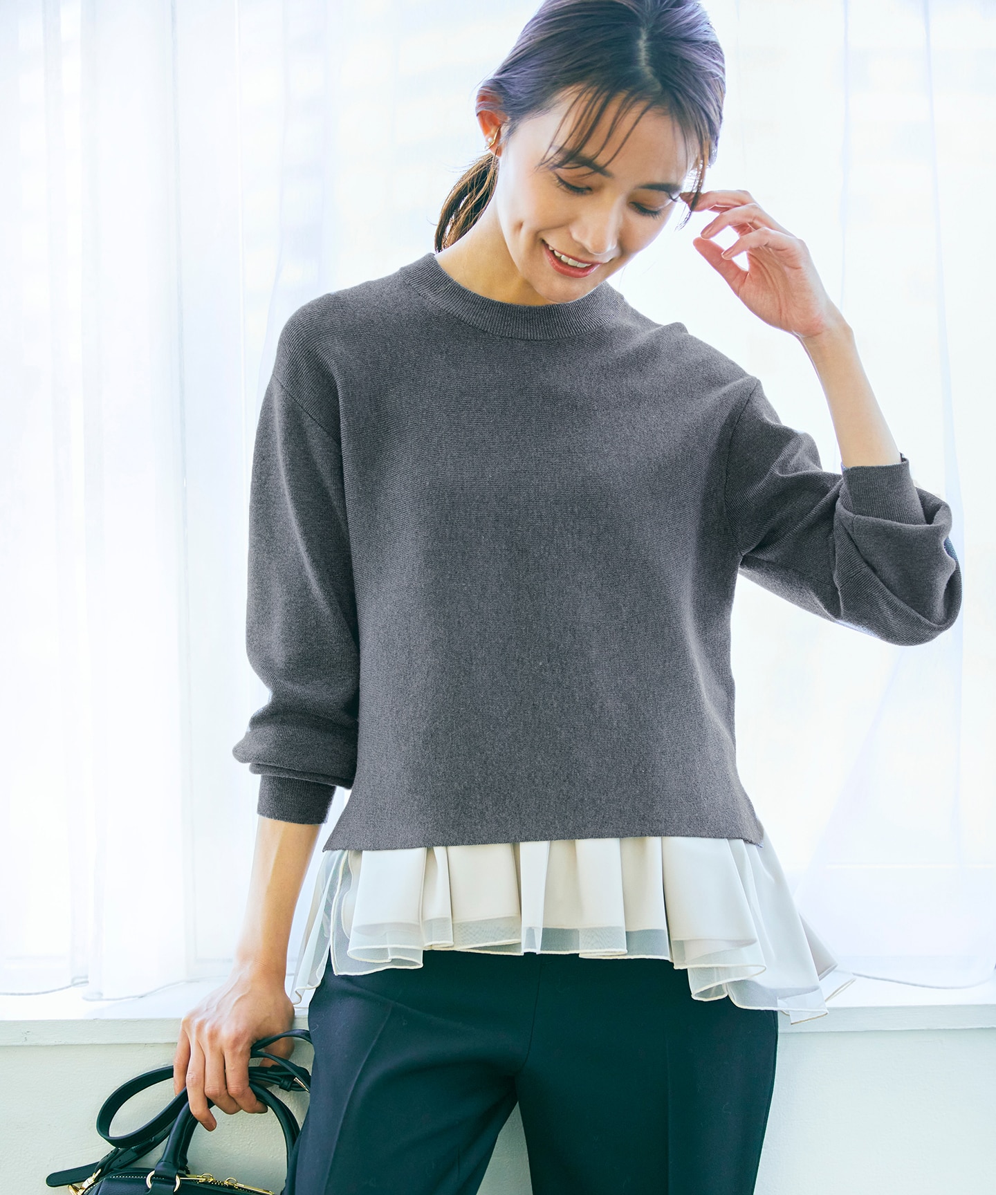 1枚あればコーディネートがきまる、今年らしいチュールキャミソール付きの、ツインセットニット。それぞれ単品使いもできて1枚あるとコーディネートの幅が広がります。端境期の「何着よう?」の強い味方になってくれるアイテム。