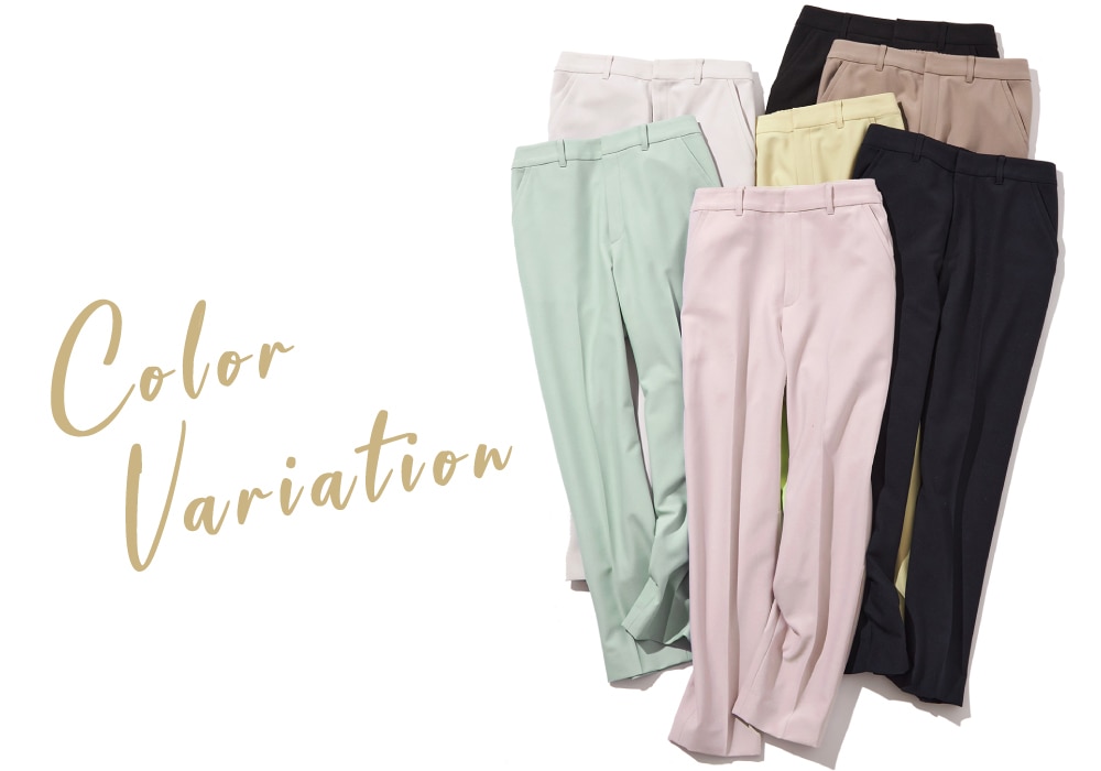 定番の美脚見えパンツも春カラーをチョイスして鮮度アップ!