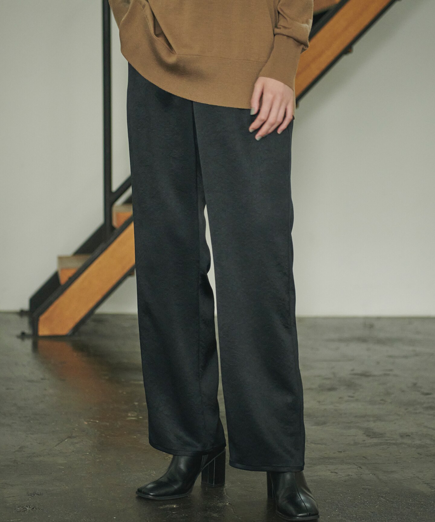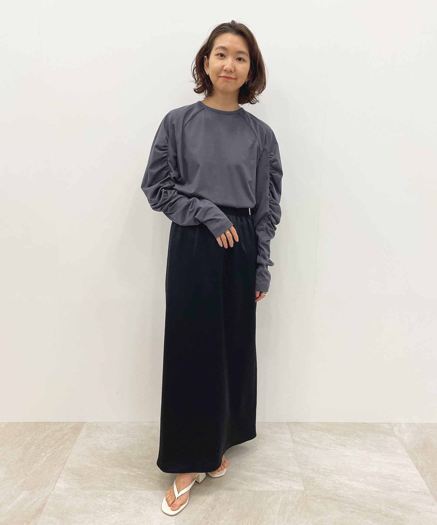袖のギャザーデザインが可愛いカットソーです。肘周りにくしゅくしゅっと溜まる布がモードな雰囲気です。袖口、裾、襟ぐりはブラウス仕立てで、カジュアルになりすぎず、ブラウス感覚で着られます。サテンのスカートと合わせてカジュアルになりすぎないスタイリングに。