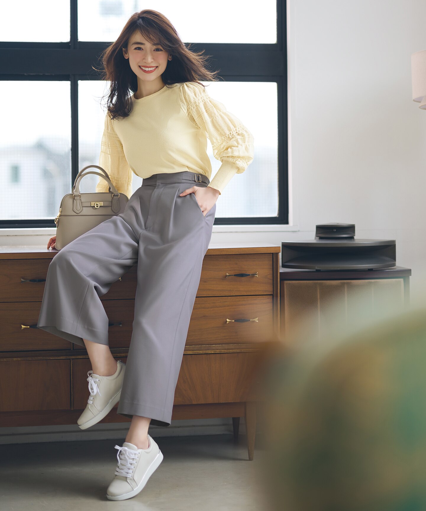 袖コンシャスなデザインニットにワイドパンツやスニーカーを合わせて程よく甘さを抑えたコーデ。