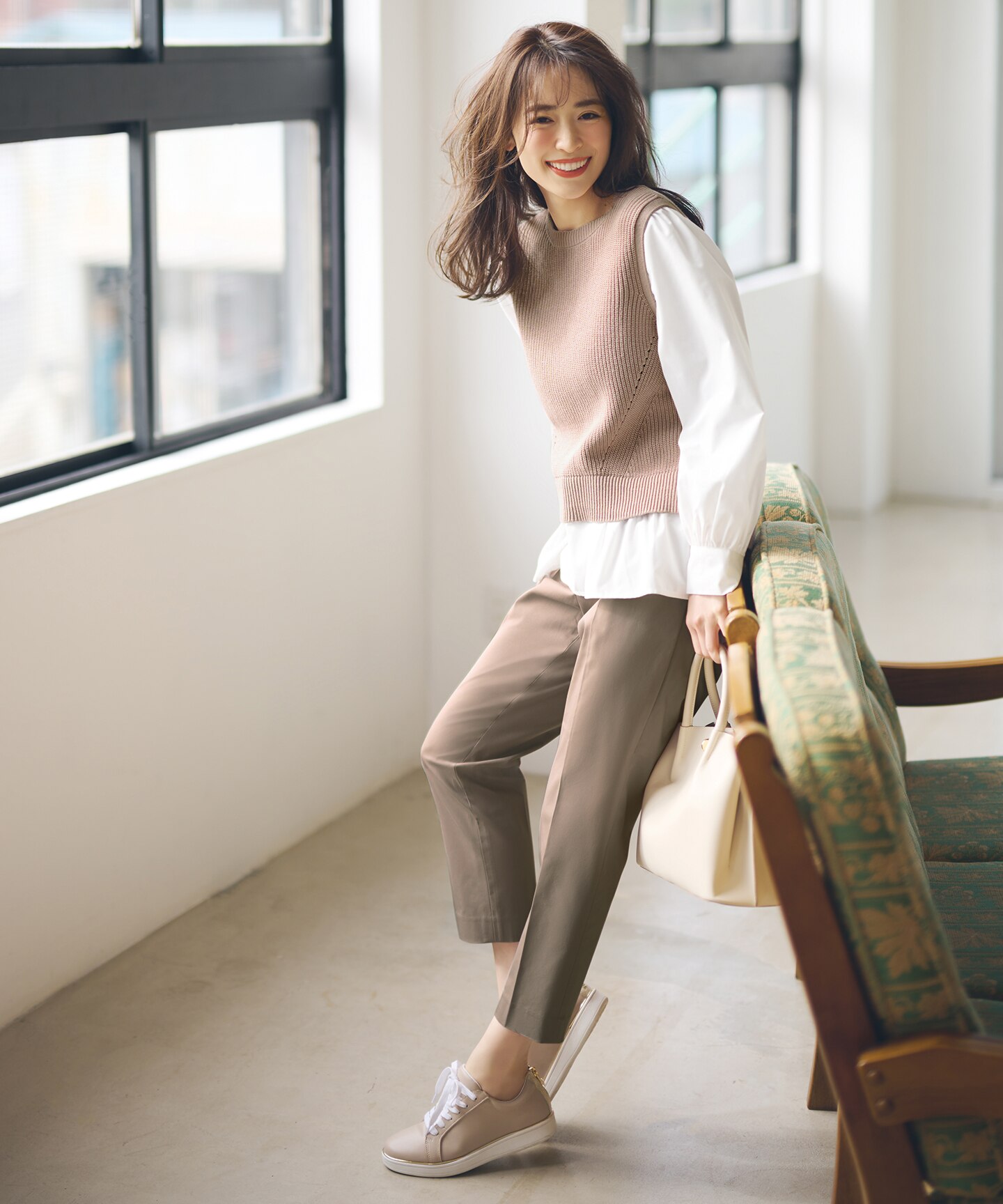 ブラウン系のパンツを合わせて同トーンでまとめるのが洒落見えポイント♪