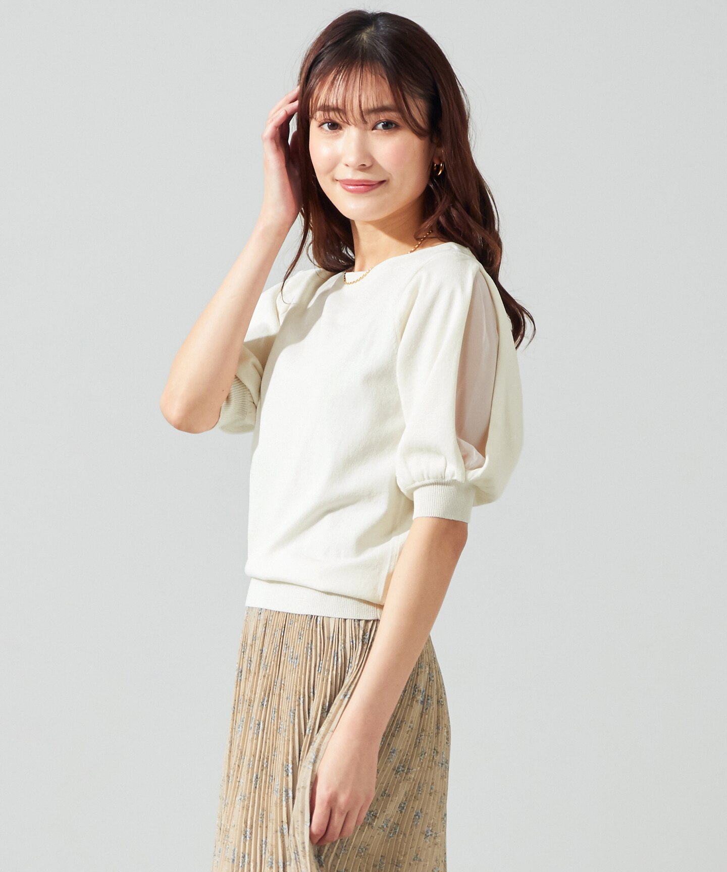 袖に透け感のあるシフォン素材を使用した異素材切替のニット