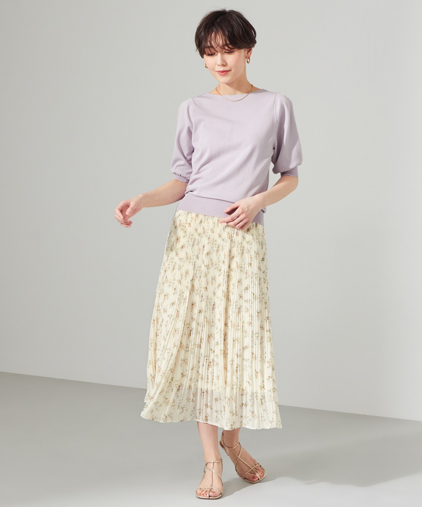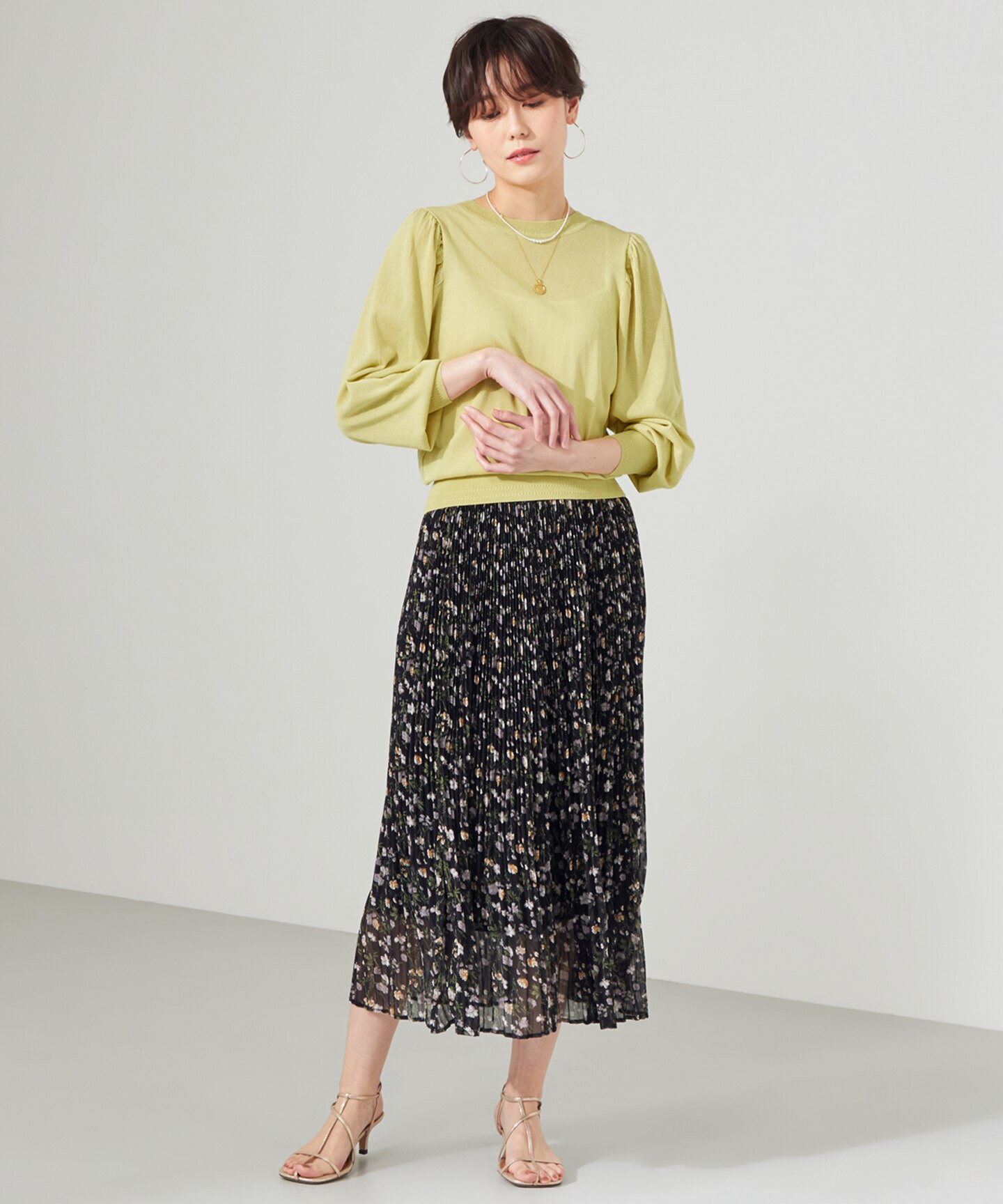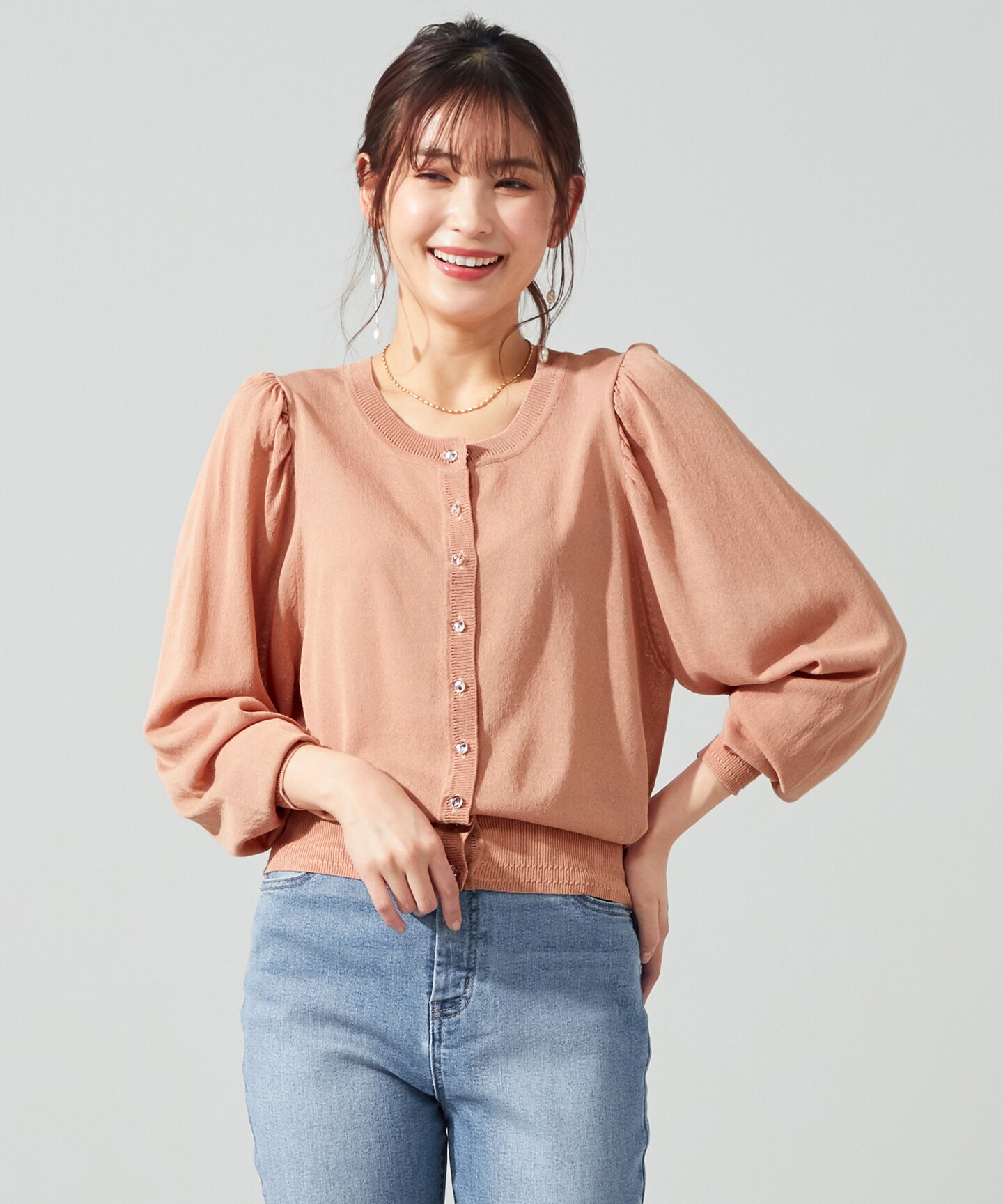 首元と身頃のシルエットをすっきりまとめつつ、ボリュームスリーブでメリハリを付けた女性らしいデザインがポイント
