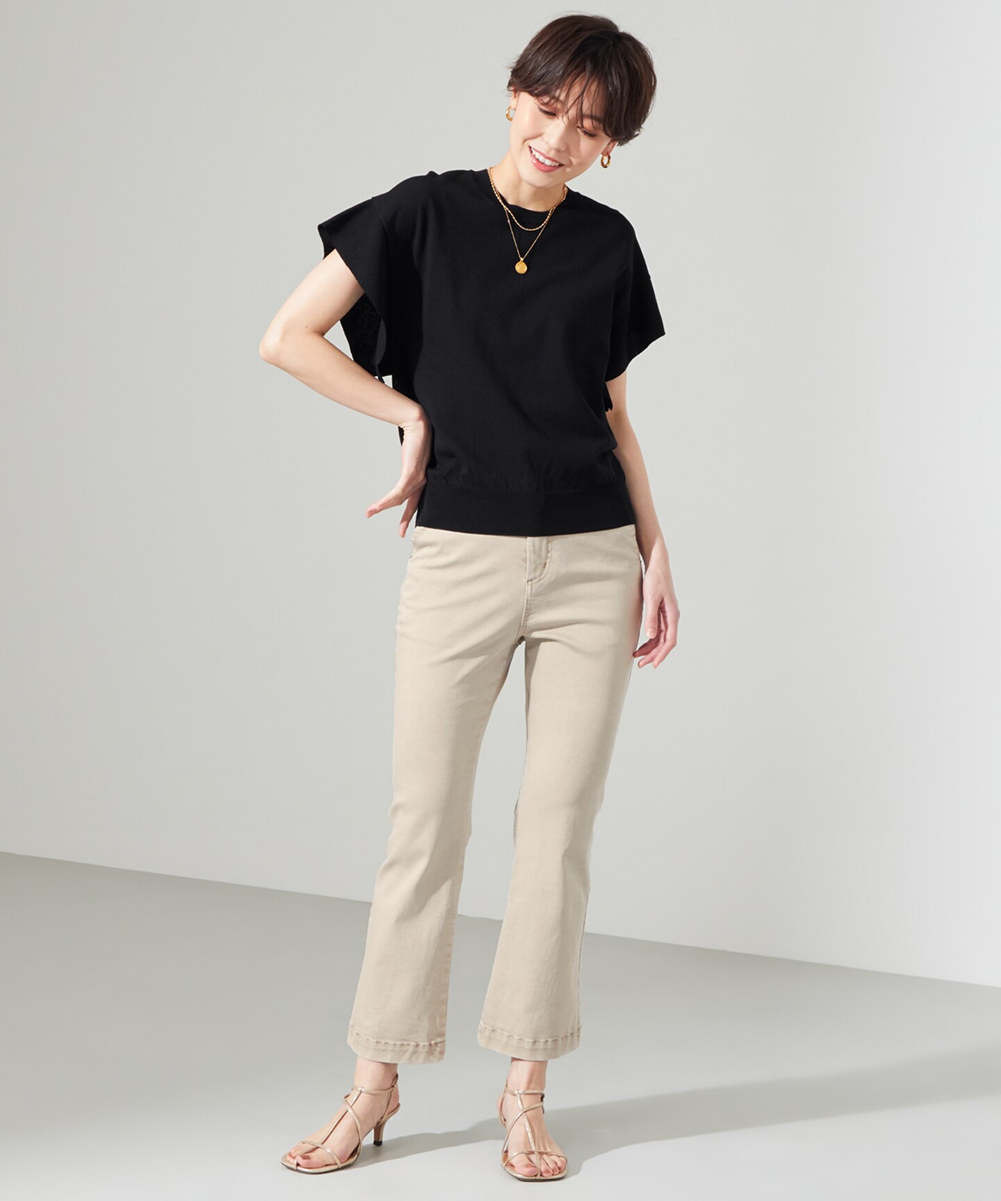 袖をパネルで切り替え、フリルスリーブのように仕上げたデザインニット。