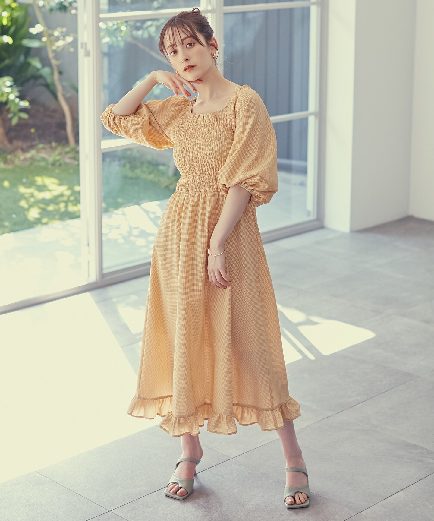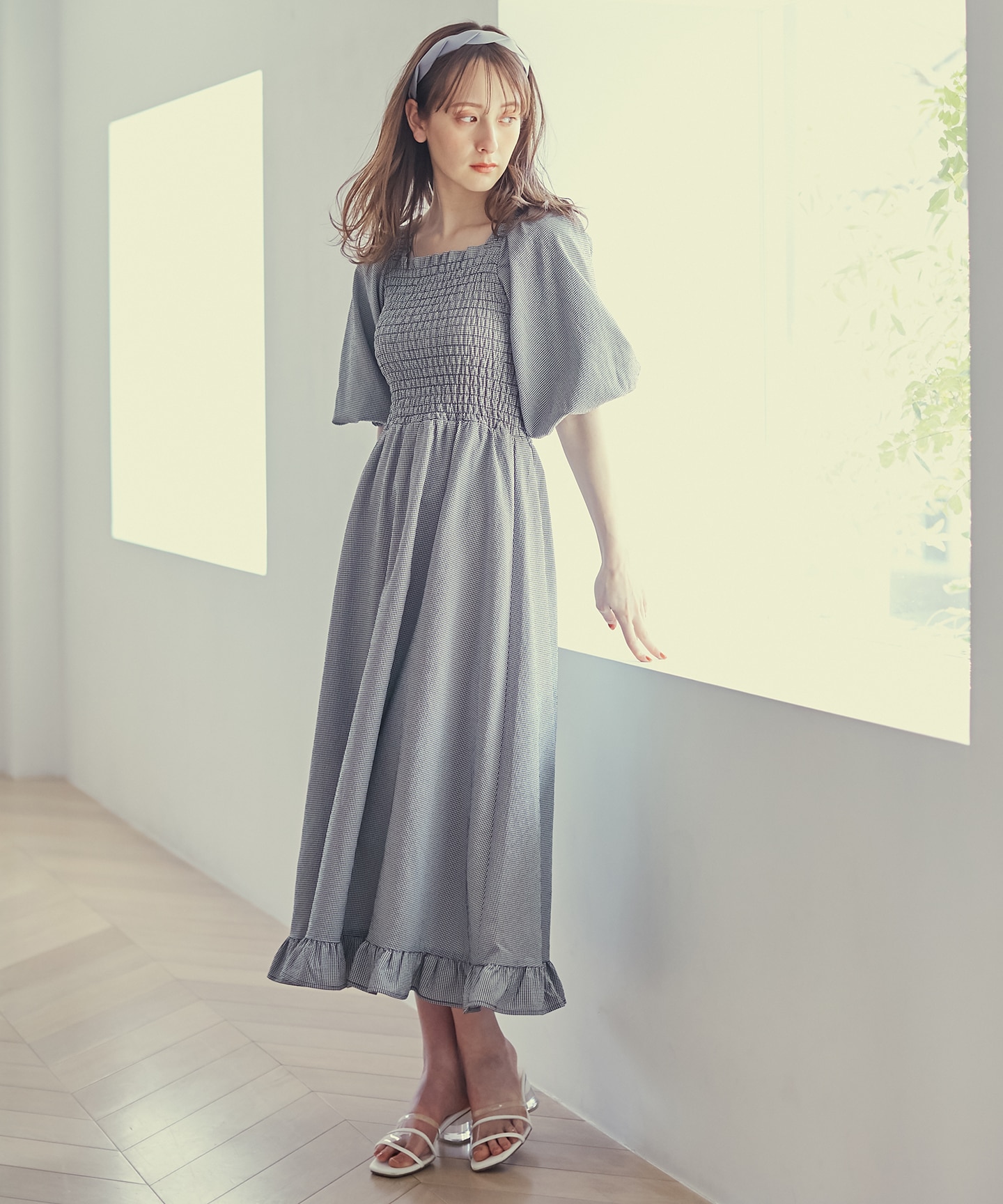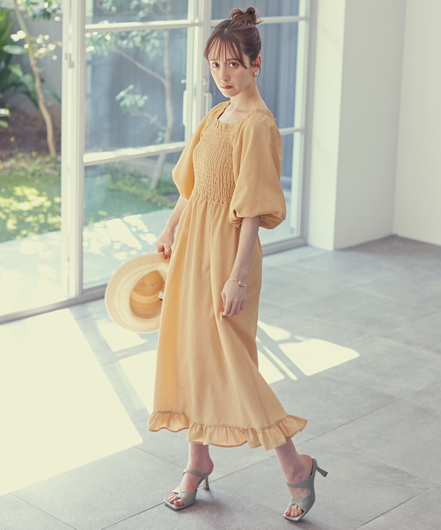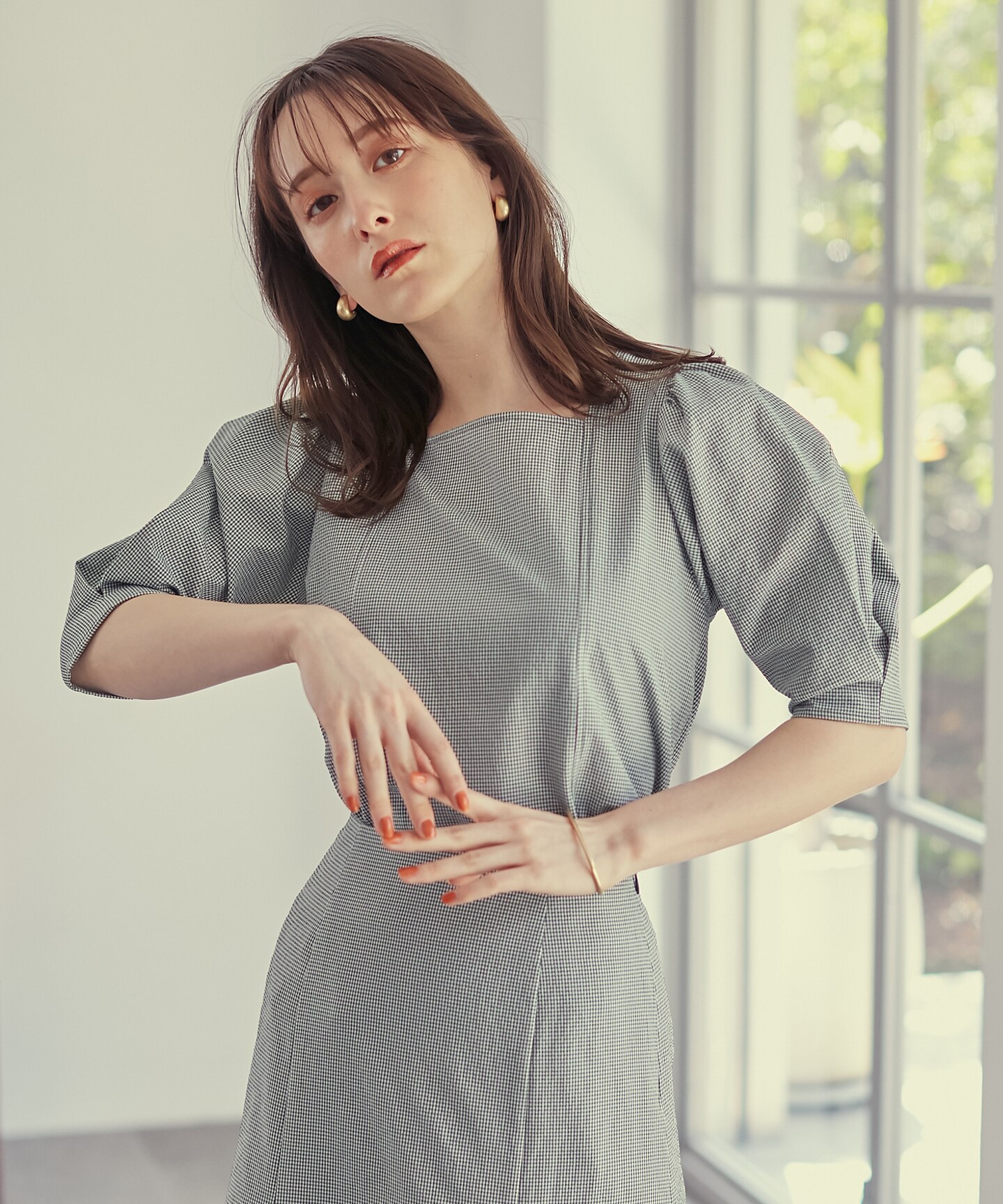 見頃のギャザーデザインが全体の印象を引き締め、メリハリのある大人可愛い1枚