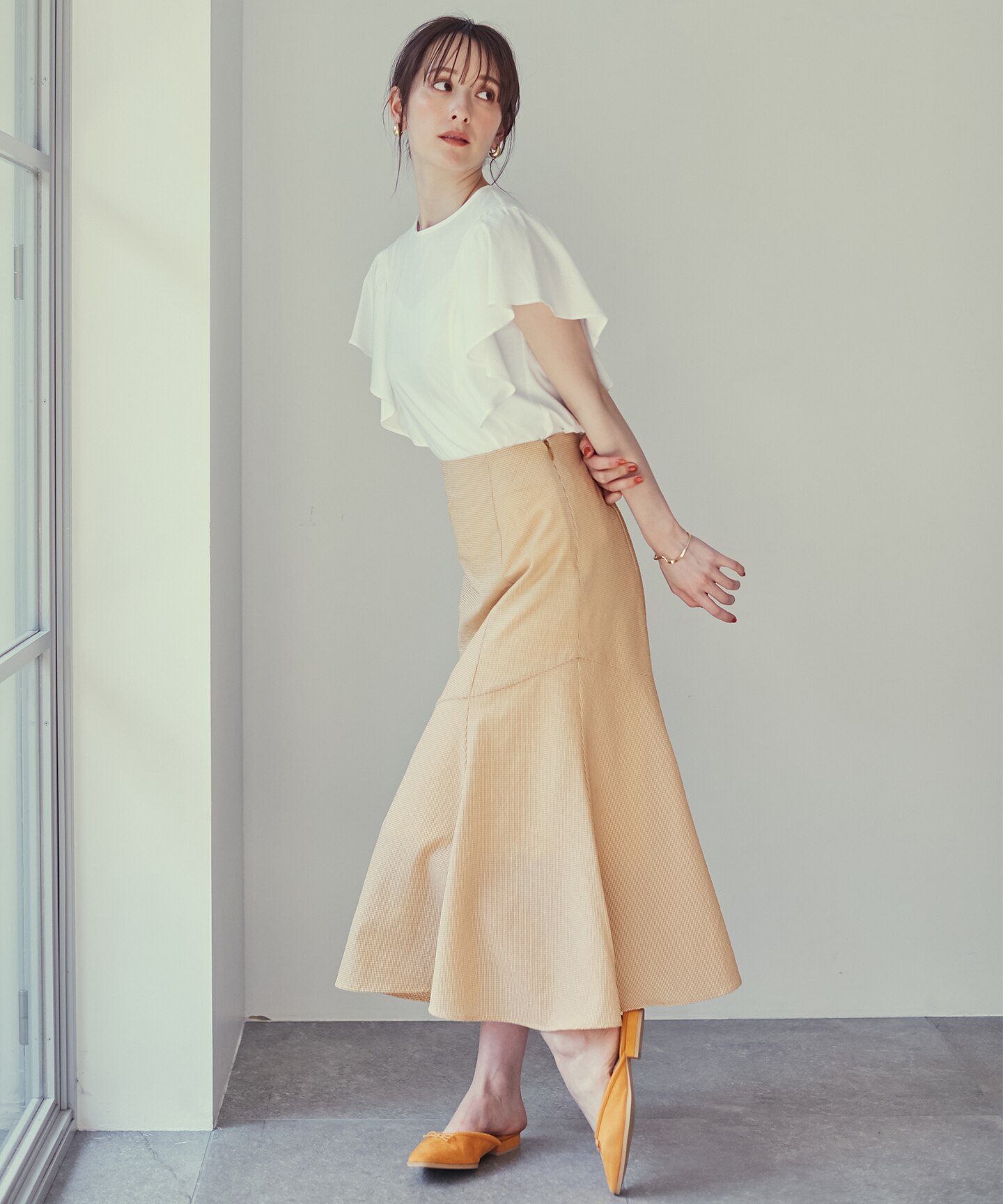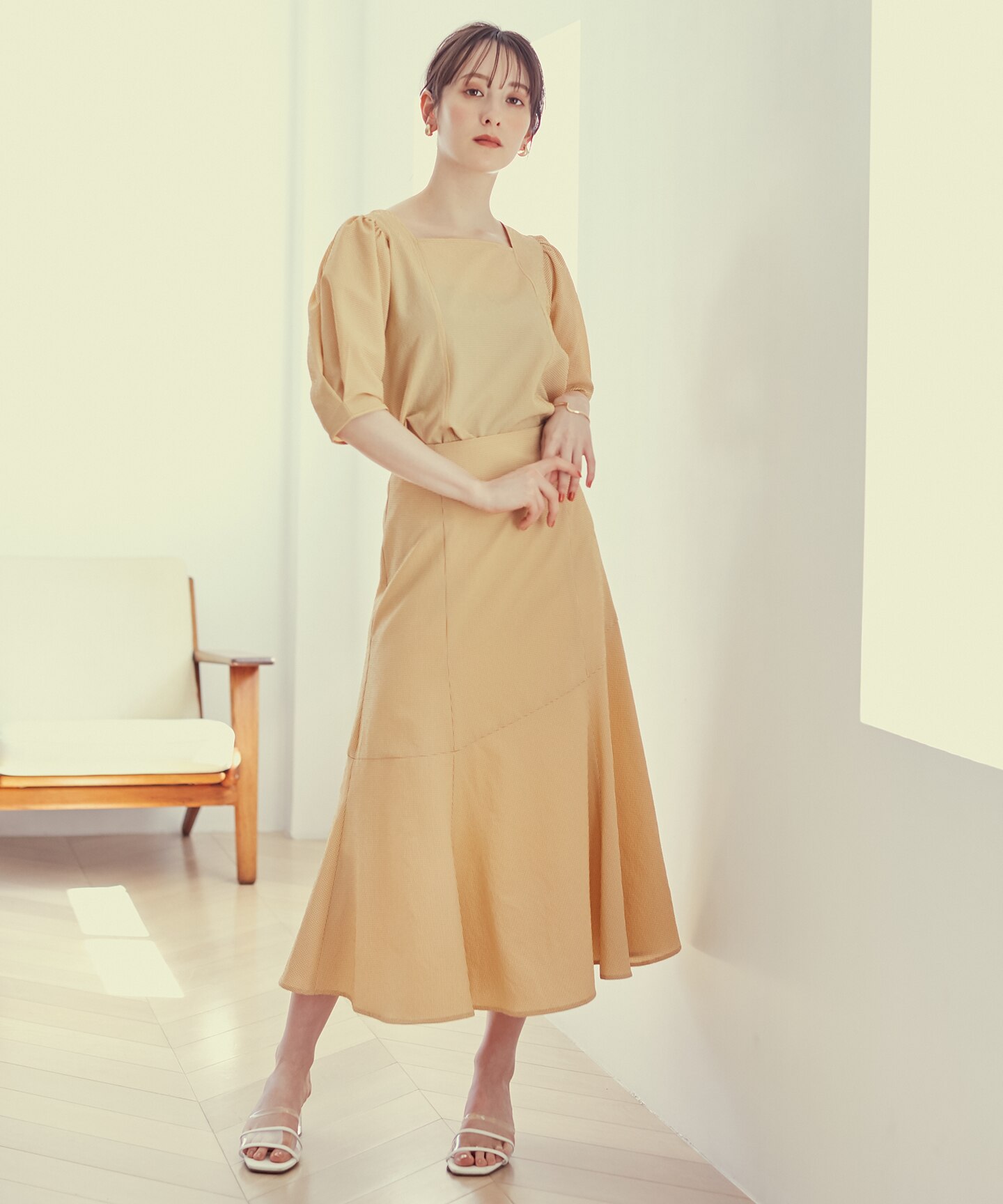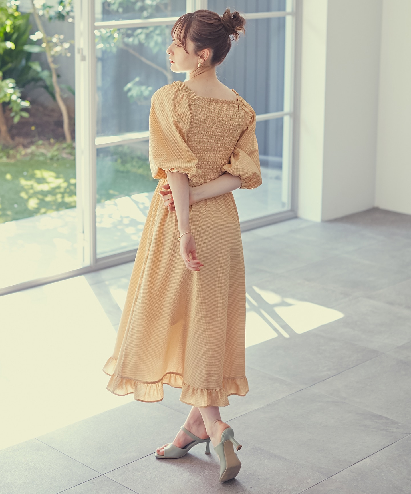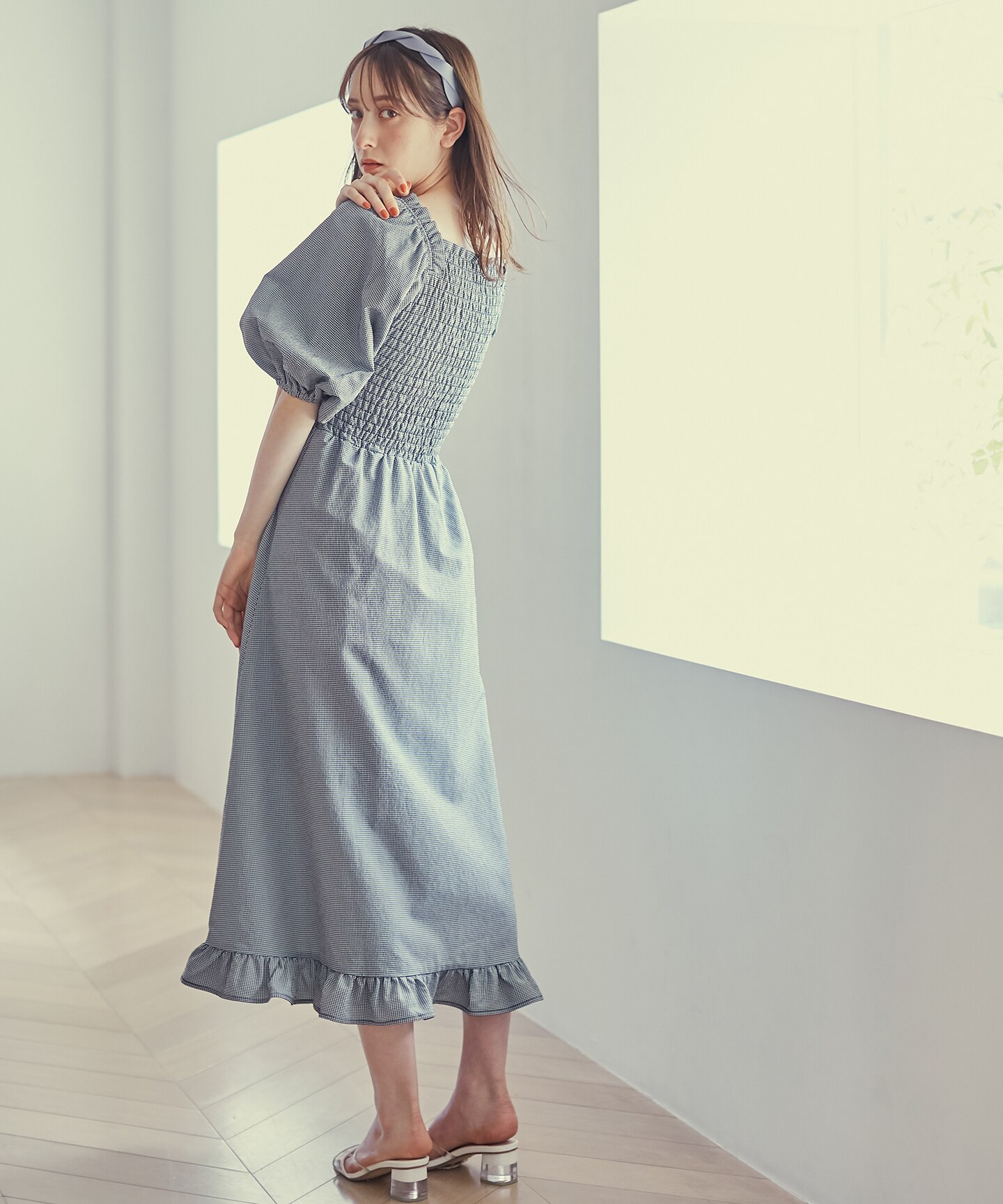 見頃のギャザーデザインが全体の印象を引き締め、メリハリのある大人可愛い1枚