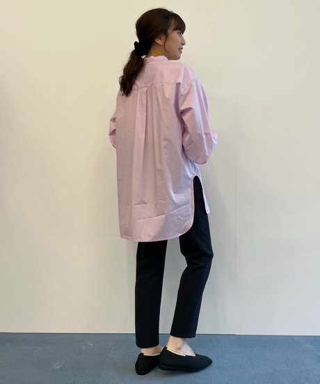 シンプルなシャツ×ブラックパンツのコーデをより印象深く見せるのはかかとのさりげない配色。