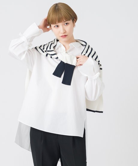 ゆったりシルエットのシャツチュニック。袖口デザインと