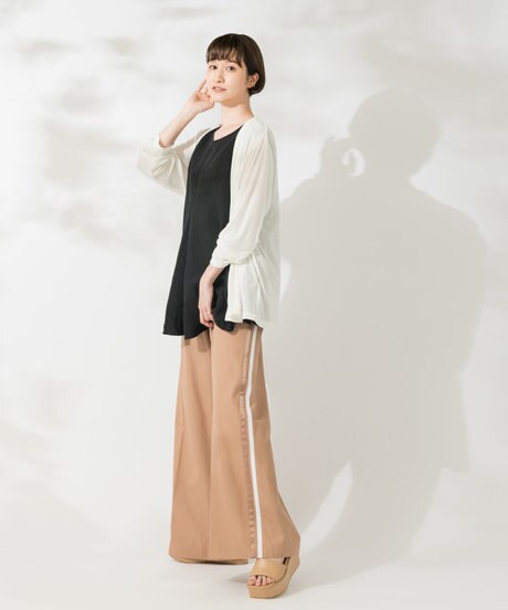 Aラインに広がるワイドパンツは、サイドの異素材のライン使いがアクセント