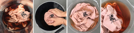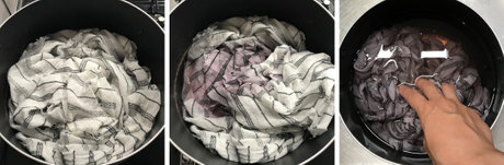 染液を冷ましてからぶどうを取り出し、ストールを鍋に浸します。