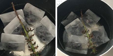 ぶどうの皮をお茶パックに詰めて、茎と一緒に鍋に入れます。