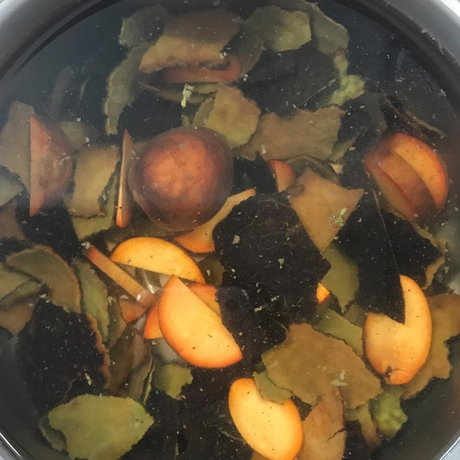 ほんのりピンクがかった茶色い染液が出来ました。