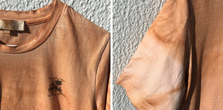こちらのTシャツは染めている時は気がつきませんでしたが、乾かしてみるとタイダイ染めのような仕上がりになっていました。