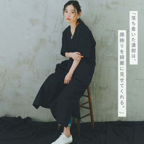 “落ち着いた濃紺なので、顔映りがすごく綺麗に見えます。華奢なネックレスを合わせたり、薄手の上着を羽織ったりするとより大人なスタイルになりそうです。袖を折るとシルエットが変わるので、ぜひその日の気分で選んでもらえたら◎”