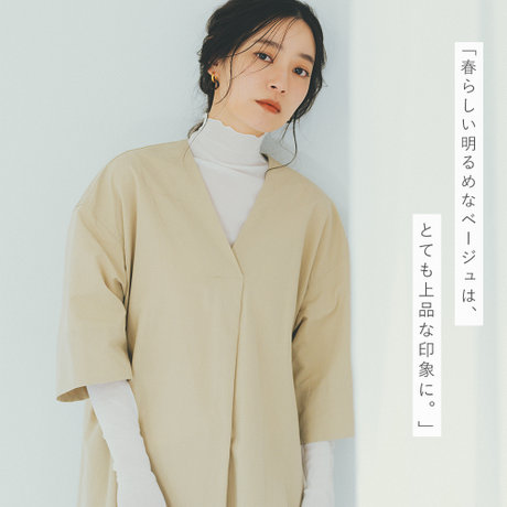 “春らしい明るめなベージュはとても上品な印象に仕上がりました。シアー感のあるインナーを合わせて今っぽさも演出できますが、ボーダーアイテムなどを合わせてカジュアルさも出せる振り幅があります。ボトムスにあえて色を入れるコーデも楽しめそう!”