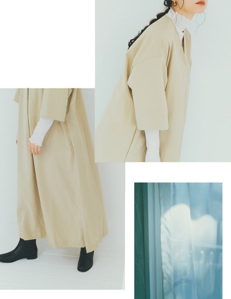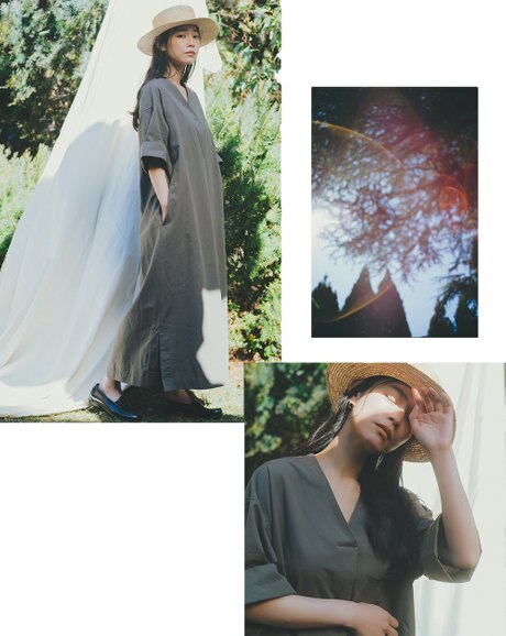 “深めのカーキは肌馴染みが良く、普段使いにぴったり。シルエットがのっぺりしないようにデザイン性のあるタックを前見頃に入れたので、さらっと一枚で着るだけでもキマります。スニーカーやサンダルも可愛いですが、ここはあえてブーツを合わせてかっこいいスタイルもおすすめです。”