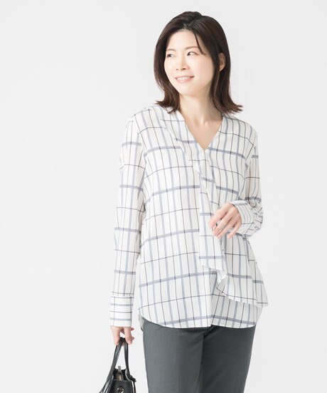 ベーシックなカラー合わせの中に華やかさをプラスしてくれるデザイントップス