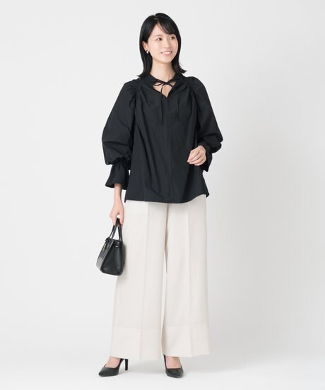 襟元と袖のデザインがポイント。ダークカラーで甘さを抑えた大人スタイル。