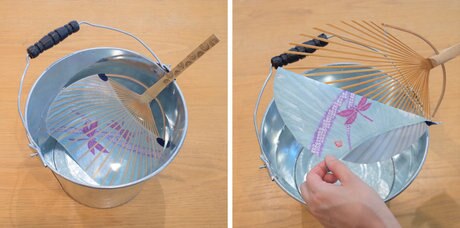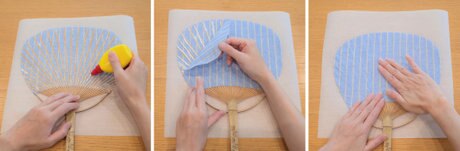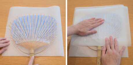 うちわをぬるま湯に約5分つけて紙を柔らかくし、丁寧に剥がします。