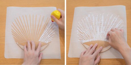 骨組みの反対側にもボンドを塗り、もう1枚の布をシワができないように丁寧に貼ります。