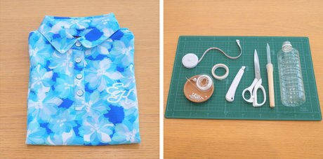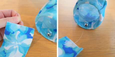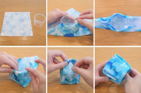 両面テープを剝がして、ペットボトルを包むように対角線上に布を折り、四隅の両面テープはペットボトルの内側に貼り付けます。