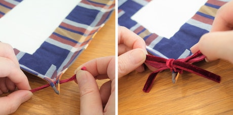四隅の穴を開けたところに紐を通して結びます。