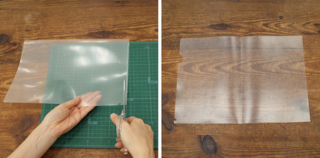クリアファイルの重なっている部分をハサミでカットして、1枚のシートにします。