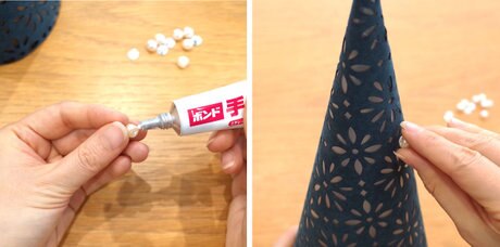 ボンドを使い、ツリーの表面にパールやラインストーンをお好みの箇所に貼り付けます。