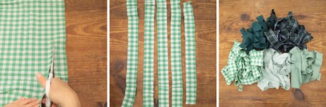 5枚の洋服をそれぞれ約5㎝×20㎝のサイズにカットしたものを各9本ずつ用意します。