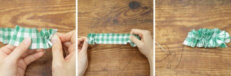 布の真ん中を針と糸で縫い、布を寄せてギャザーフリルを作ります。