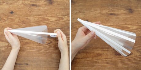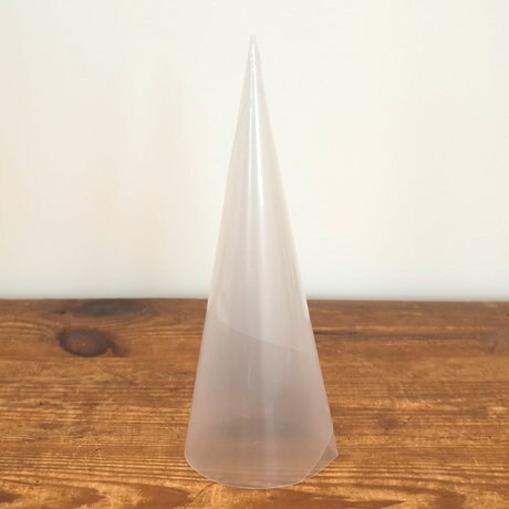 開いたクリアファイルを端から丸めて、先がとがるように円錐形にします。