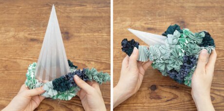 土台が隠れるように、底から先端までギャザーフリルを巻き付けていきます。
