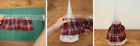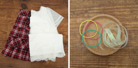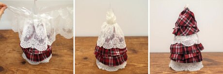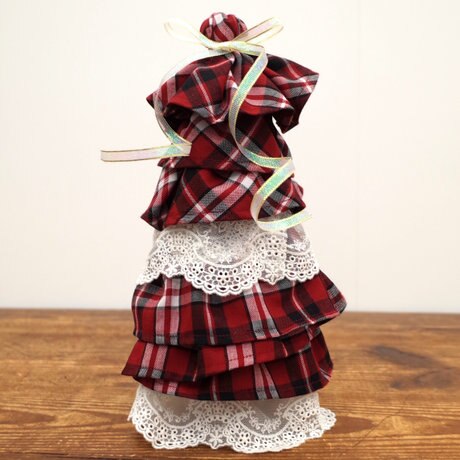 洋服の裾部分を使ってフリル状に飾り付けていく立体感のあるツリーを作ります。柔らかい素材やレースを使うとよりゴージャスなデザインに仕上がります。