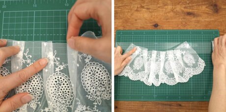 カットした布を均等につまんで折りたたみ、フリルを作ります。