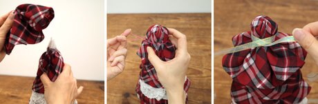 先端を覆うように被せて輪ゴムで固定し、リボンで飾り付けをします。