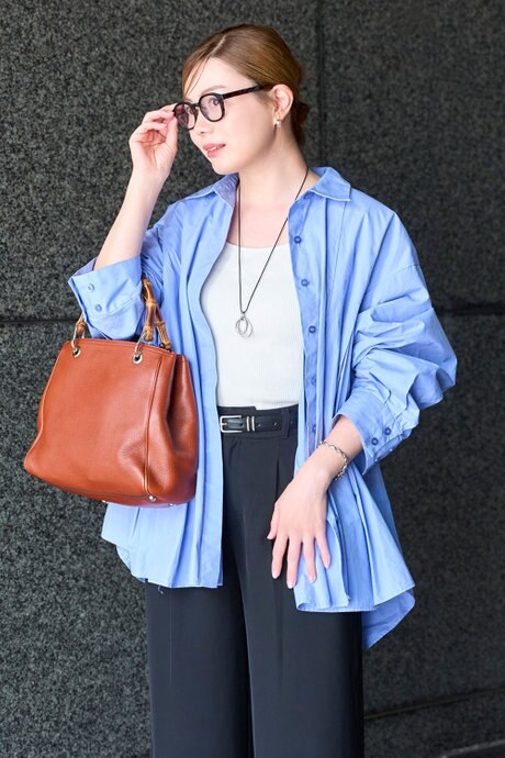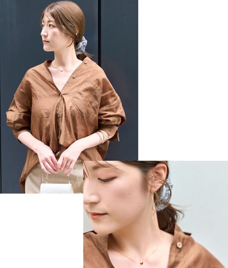 シンプルなブラウスコーデに華やぎを添える、