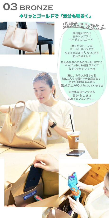 愛され続ける「ミディアムレザレット」の秘密に迫る!私ならこう使う!色違いで楽しむ3つのスタイル 01:ブラック ROOTOTE 0188【オフィシャルストア限定】LT.ミディアム.レザレット.RTG-A ¥5,940 02:ダークシルバー ROOTOTE 0188【オフィシャルストア限定】LT.ミディアム.レザレット.RTG-A ¥5,940 03:ブロンズ ROOTOTE 0188【オフィシャルストア限定】LT.ミディアム.レザレット.RTG-A ¥5,940 Vol 1 デザイナー編 ≫≫≫ お仕事ルートート一覧 ≫≫≫ ROOTOTE TOP ≫≫≫