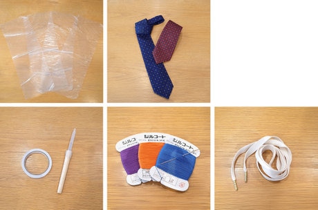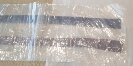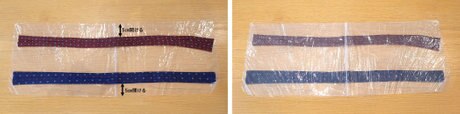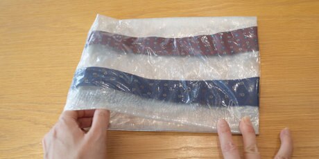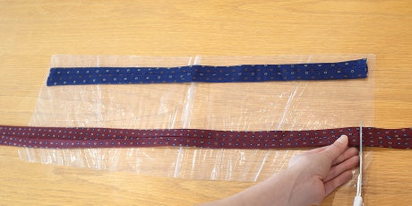 ビニールを1枚広げ、その上にネクタイを2本置き、ビニールより約1cm短く切ります。