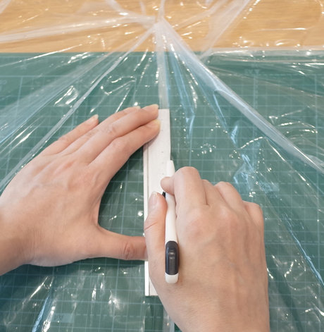 A4用紙をビニールの上に置いて黒い点線の部分を切ります。