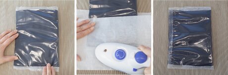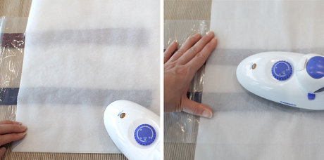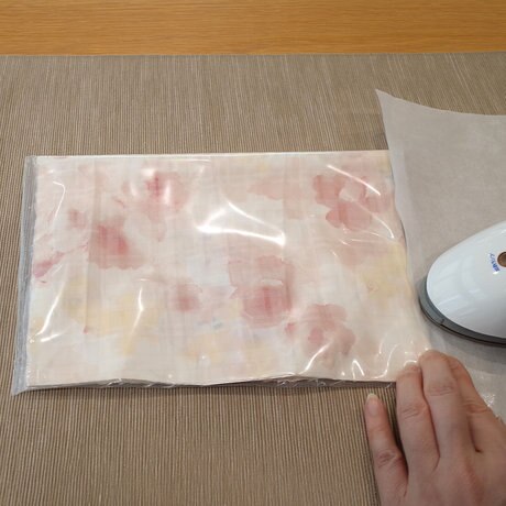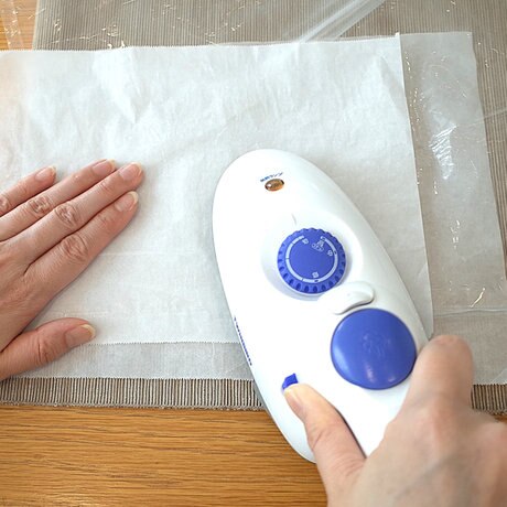 クッキングシートで挟んで、すべてのビニール同士がしっかり圧着されるように丁寧にプレスしていきます。