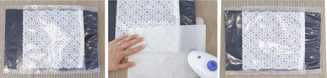 次に、ネクタイの裏側が上になるように置き、残りの2枚のビニールをその上に重ねて全体をプレスします。