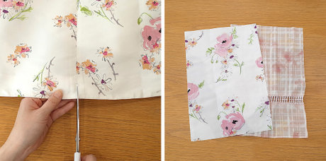 2種類の布を、先程切ったビニールの大きさより縦1cm、横2cm小さいサイズに切ります 。