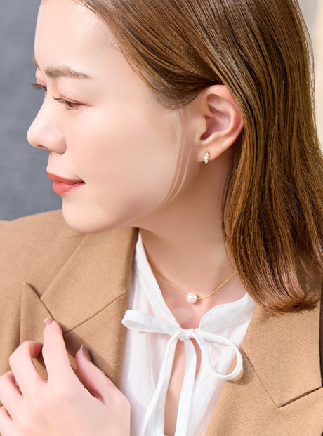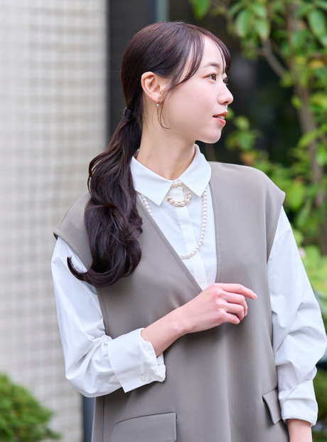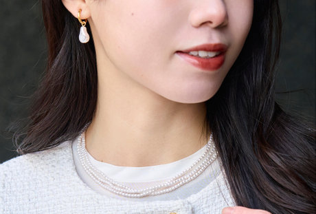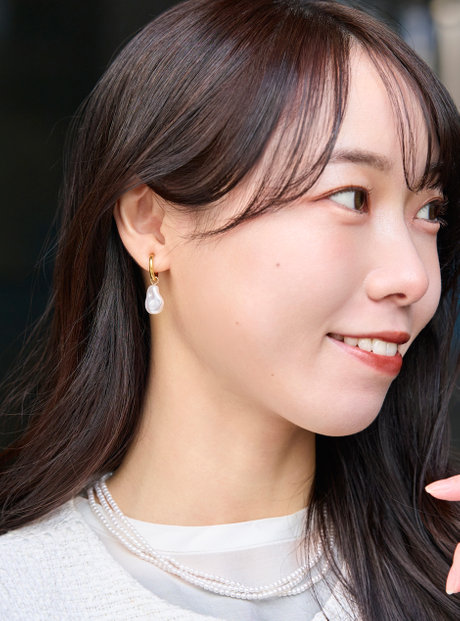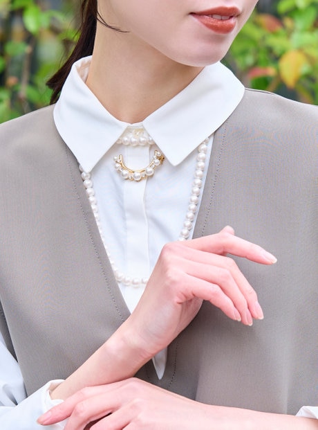 首元にはパールを重ねて奥行きを。